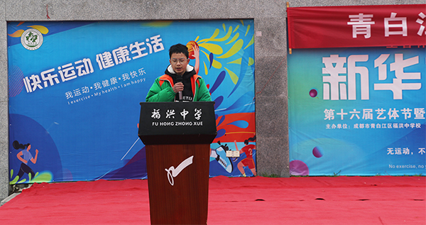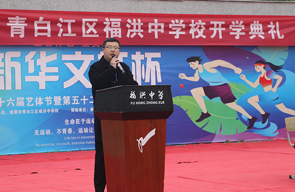 福洪中学校王灿副校长为开学典礼致辞,他回顾了上一学期全校师生共同努力下取得的喜人成绩,肯定了学校进行课改所取得的成果,并提出了新学期的期望和要求,希望全校师生乘着春风奋发拼搏,再创优绩。