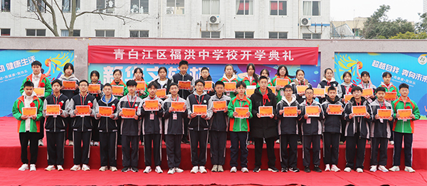 福洪中学校叶家礼校长、向继国副书记、王灿副校长分别宣读初三、初二、初一年级表彰学生名单,获奖学生进行了“戴红花、过红门、点龙睛、签红名、合红影”的表彰活动;同时,教导处文辉主任进行了发言,向同学们分享了学习上的锦囊妙计;安全办蒋礼忠主任、福洪中学法治辅导员,福洪镇派出所曾警官进行了开学安全主题教育发言,希望同学们时刻牢记安全第一,警钟长鸣。最后张主任作结束发言,宣布2022-2023学年春季开学典礼圆满结束。