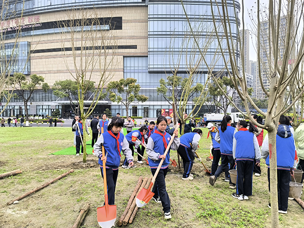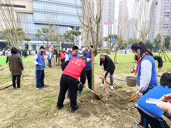 阳春三月,草长莺飞,春风吹绿了枝头上的嫩芽,也吹动了学生们的热情。活动现场,绿化公司专业老师向师生们介绍了植树节的来历,让他们对植树节有一个初步的认识,并了解植树的意义和认识保护植物的重要性。接着学生们拿着提前准备好的树苗以及挖铲等工具,来到实践区域进行种植。学生们在绿化公司老师、社区工作人员、党员志愿者的帮助下,铲土填坑、种植浇水,忙得不亦乐乎。