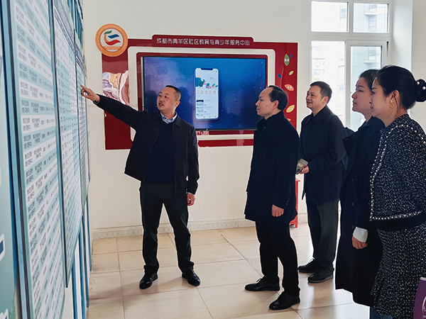 在服务中心主任柏恒、副主任张帆、廖娟等陪同下,重庆江北区教师进修学院党委副书记杨长宏、成教中心主任韦杰峰等一行4人通过展板介绍了解到青羊社区教育的整体工作开展情况、青羊“云上学习”方式的打造、12个街道社区教育学校各自开展社区教育工作特色亮点等。