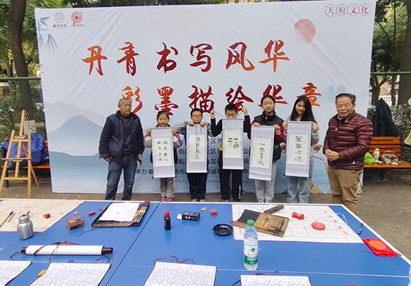 蜀地自古多才华,尤以优雅纵古今。成都作为最具活力新一线城市,时尚指数日益提升的同时,越来越多的传统文化与新潮流、新时尚有机结合。为更好地将优雅时尚的天府文化与笔墨丹青相融合,不断提升社区居民的艺术鉴赏水平和文化造诣,激发社区各年龄层次居民的活力,2024年11月28日下午,成都高新区桂溪街道和平社区在社区小广场开展“丹青书写风华,彩墨描绘华章”主题书画展览活动。
