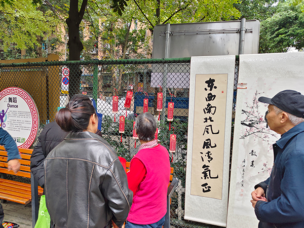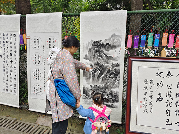 活动现场展出的30余幅书法、绘画作品皆出自社区书画爱好者之手,他们用笔墨描绘祖国山河,书写生活感悟,展现出较高的艺术水准和对生活的热爱。同时,社区在活动现场设置现场书写和猜谜板块,不仅将成都深厚的文化底蕴通过卷轴和扇子展现出来,还带动社区居民积极参与到猜谜活动中。